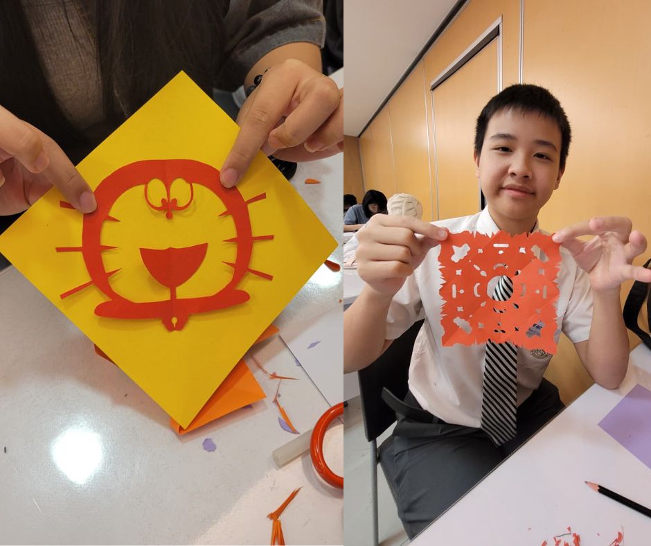 李老師以生動活潑的方式介紹剪紙的歷史淵源與藝術特色,從傳統民間圖騰到現代創意剪紙的演變,讓同學認識這門源遠流長、富有文化底蘊的藝術形式。課堂中,老師逐步示範摺疊與剪裁技巧,並鼓勵同學們大膽嘗試構圖與創作。